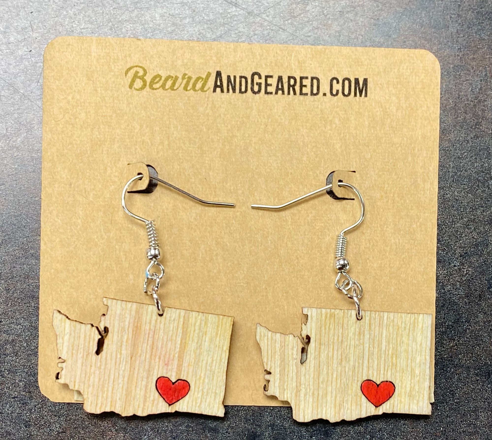 My heart is at home - show off where your heart is at with these adorable earrings! Made of a light weight birch veneer and available with outlines for your state (or perhaps even country) and heart location of choice.